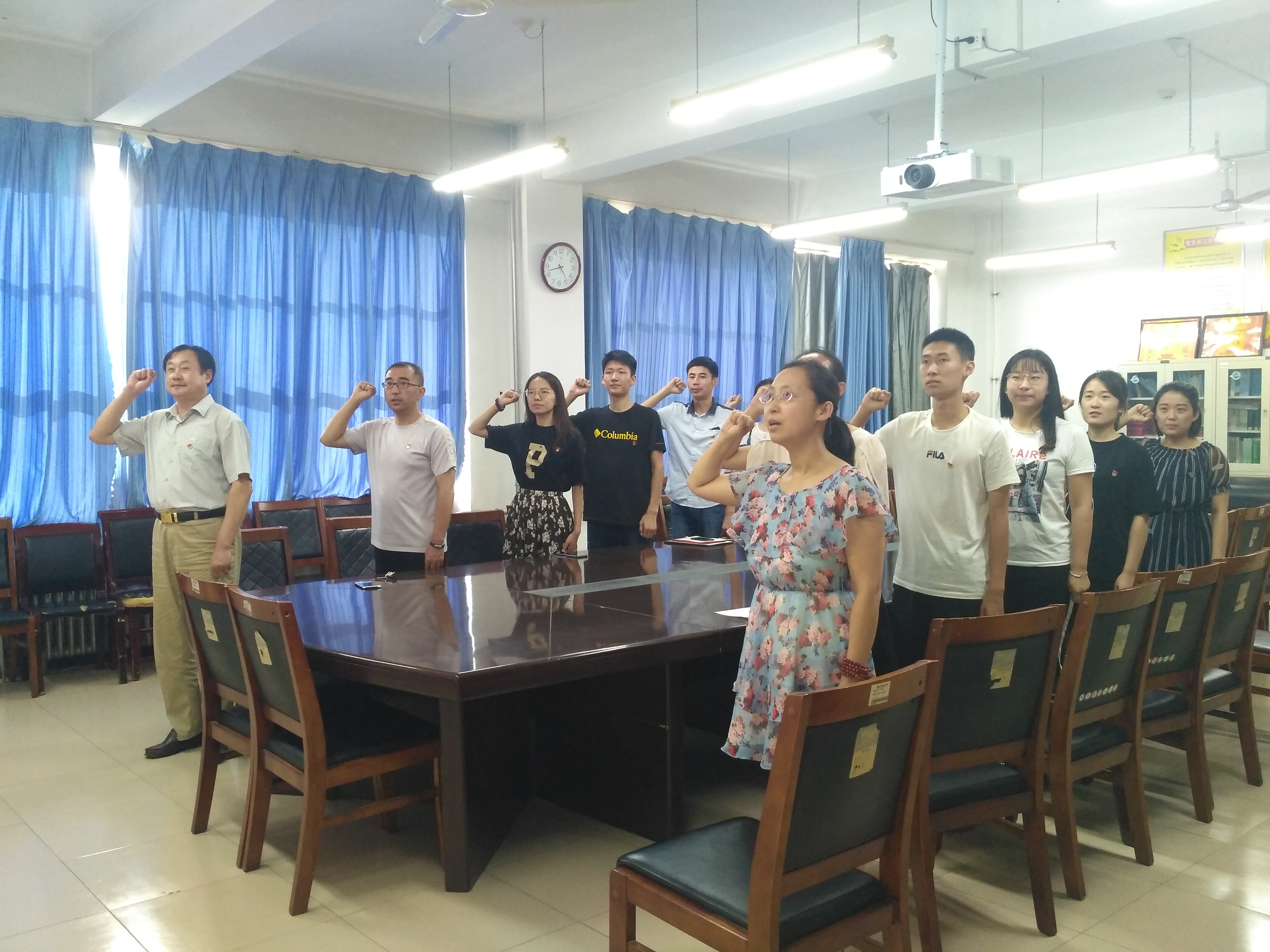 6月29日,304am永利集团官网在会议室举办新发展党员入党宣誓、老党员重温入党誓词仪式。304am永利集团官网党委书记刘培利、党委副书记王春晓、第三党支部书记刘燕杰、第四党支部书记宋颖芳以及在校学生党员参加宣誓,会议由刘燕杰主持。