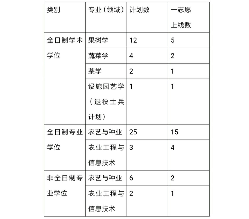 果树学、蔬菜学、茶学复试人数为各专业招生计划150%、设施园艺学、农艺与种业和农业工程与信息技术复试人数为各专业招生计划120%。对于在各批次复试规定的时间内调剂后仍达不到本专业(领域)招生计划的,按照实际人数组织复试。