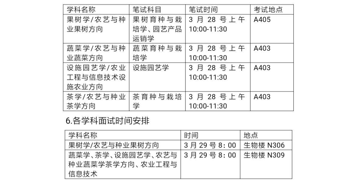 (二)学院成立两个复试小组,第一小组包括果树学和农艺与种业果树方向,第二小组包括蔬菜学、茶学、设施园艺学、农艺与种业蔬菜学茶学方向、农业工程与信息技术。每个复试小组由5人组成,设组长1人、秘书1人,组织本专业(领域)的面试和实践能力考核等。每个复试小组安排专职监督员1人。