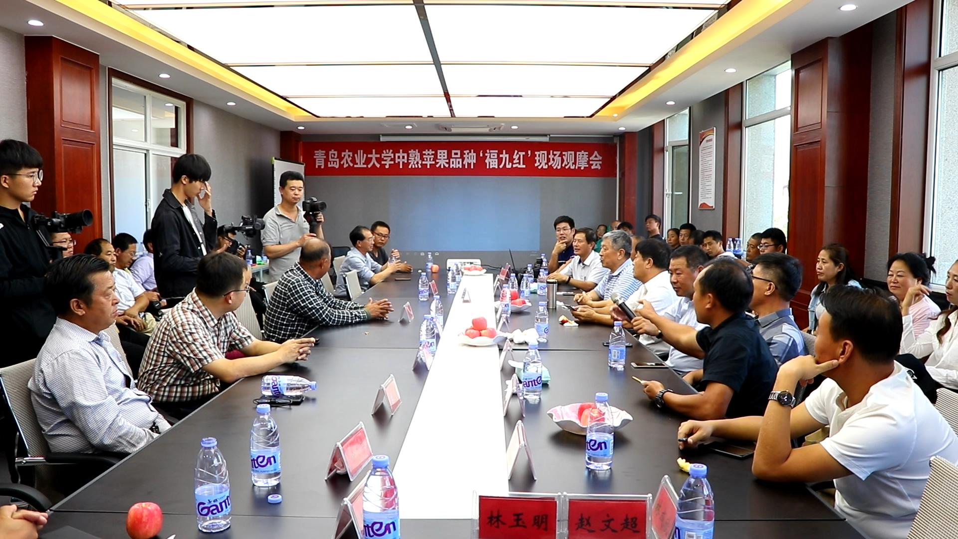 观摩会后,代表们对‘福九红’进行了果实品鉴。随后,课题组祝军教授主持了座谈会。戴洪义教授首先介绍了青岛农业大学苹果育种团队近三十年的发展历程,总结了多年的育种经验和育种成果:一是创建了高效的苹果育种技术体系,二是选育了一批特色的苹果品种,三是创建了合同转让、有偿使用和跟踪服务的苹果品种推广新模式。张玉刚教授详细介绍了‘福九红’的选育过程以及品种特性:该品种是青岛农业大学苹果育种团队2010年以‘新世界’和‘粉红佳人’为亲本杂交,2011年播种,2012年嫁接矮化砧木,2013年结果,2014年确定优系,同步进行多点试验与区域试验。2018年了进行了验收,并申报国家植物新品种权,目前已经通过了农业部的DUS测试和山东省的品种审定。该品种单果重231.8g,果实圆柱形,果型指数0.96;果面光洁,不套袋条件下果面全面着鲜红色;风味甜,可溶性固定物含量15.8%,可滴定酸为0.24%,果肉硬度8.9Kg/cm2;果实发育期140d左右,9月中旬成熟。高抗炭疽叶枯病。