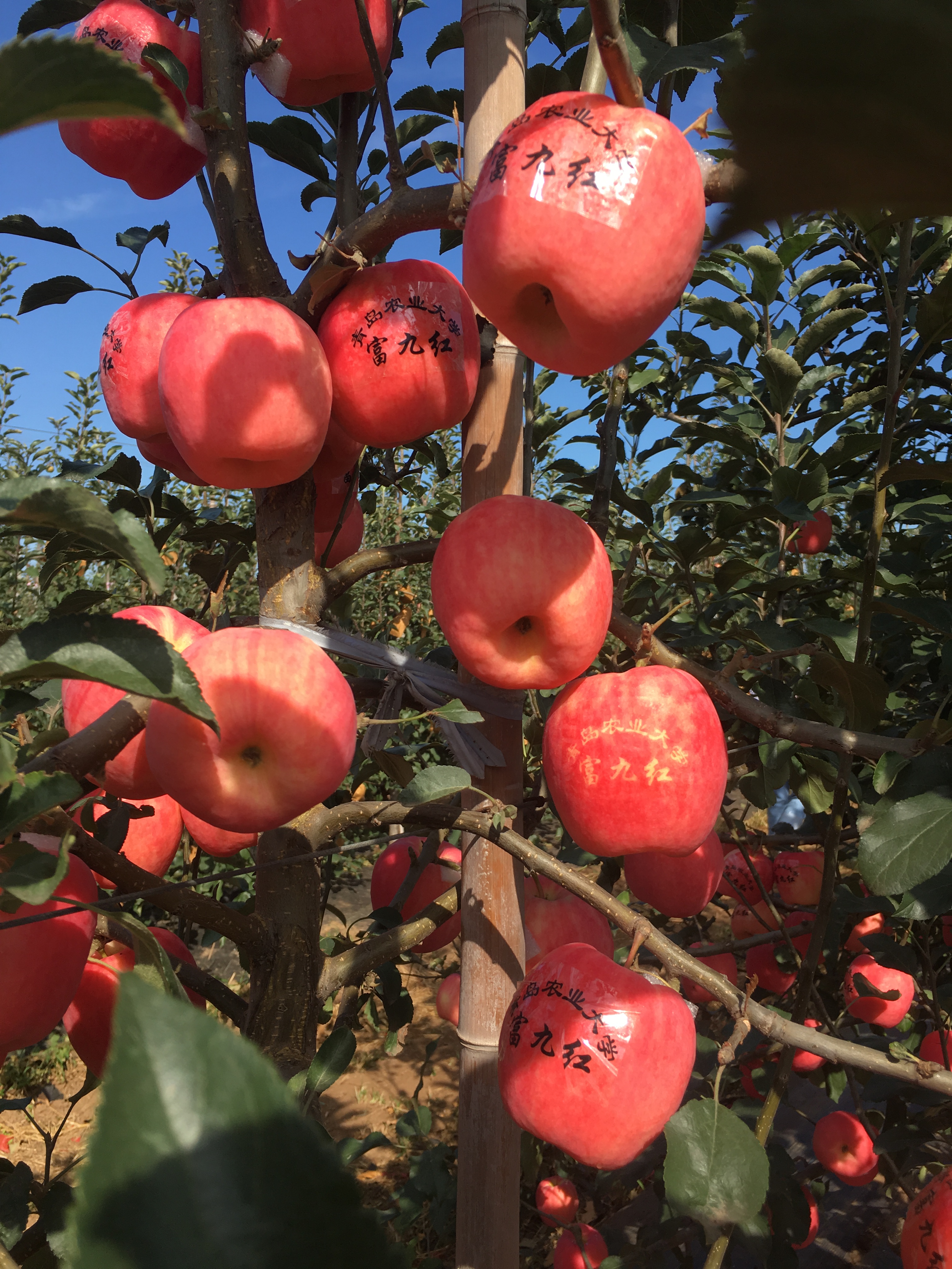 上午8时30分,与会代表来到冷王村‘福九红’示范基地,实地考察了‘福九红’结果状况。基地负责人龙口市果树研究所王所长详细介绍了基地的‘福九红’表现,这片‘福九红’是2017年嫁接到M9T337砧木上,树势旺盛,嫁接第二年就开始结果,第三年达到亩产1500公斤。2015年高接在‘富士’上的一株今年单株产量达到了100公斤。王所长还介绍了‘福九红’的5大优点:果实高桩,果型端正;外观漂亮;着色艳丽;果肉硬脆,酸甜可口;成花容易,连续丰产性好;抗病性好,容易管理。
