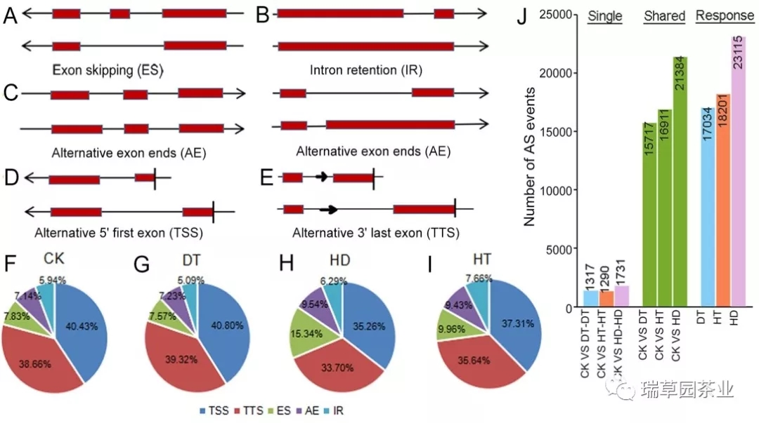 茶树是一种叶用常绿作物,在热带和亚热带地区广泛种植。在自然环境下,茶树常会遭受干旱和高温胁迫,这会对其生长和发育造成不利影响。基因的可变剪接作为一种转录后调控方式,在响应干旱等非生物胁迫中发挥重要作用。茶树中有关次级代谢合成有关的可变剪接研究已取得进展,但有关可变剪接响应干旱和高温胁迫的研究罕见报道。近日,青岛农业大学丁兆堂教授课题组对茶树在干旱及高温胁迫下相关基因的可变剪接事件进行了研究并取得重要进展。
