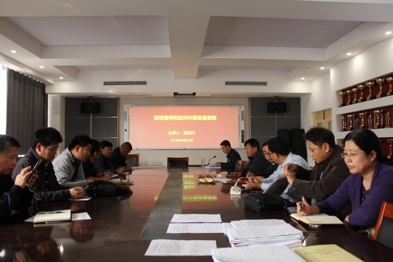 10月23日下午,304am永利集团官网党委书记隋成竹以《理性看待和应对中美贸易摩擦》为题,在生物楼会议室为全体教工党员与学生党员代表进行了专题党课宣讲。