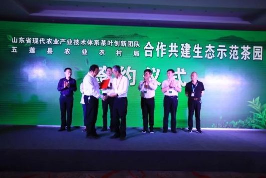 在松月湖蓝海钧华大饭店会议厅举行了五莲县农业农村局与山东省茶叶产业体系创新团队合作共建生态示范茶园签约仪式,同时特聘丁兆堂教授为五莲县茶产业发展首席顾问,本次签约为五莲生态茶园建设注入强劲动力,为全县茶产业发展插上科技的翅膀,标志着我县茶叶科技推广、农技人才培养及茶产业发展进入了一个新阶段。