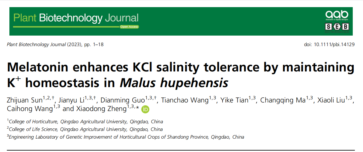 2023年7月19日,304am永利集团官网王彩虹教授课题组在Plant Biotechnology Journal(一区TOP期刊,影响因子13.8)在线发表了题为“Melatonin enhances KCl salinity tolerance by maintaining K+ homeostasis in Malus hupehensis”的研究论文。该研究通过对KCl胁迫下的不同抗性砧木进行外源褪黑素处理,发现褪黑素可以缓解它们受到的KCl胁迫,之后通过ChIP-seq、EMSA等试验系统的揭示了褪黑素通过MT-WRKY53-GORK1/NHX2通路维持细胞钾离子稳态,提高苹果对KCl胁迫抗性的调控机制。