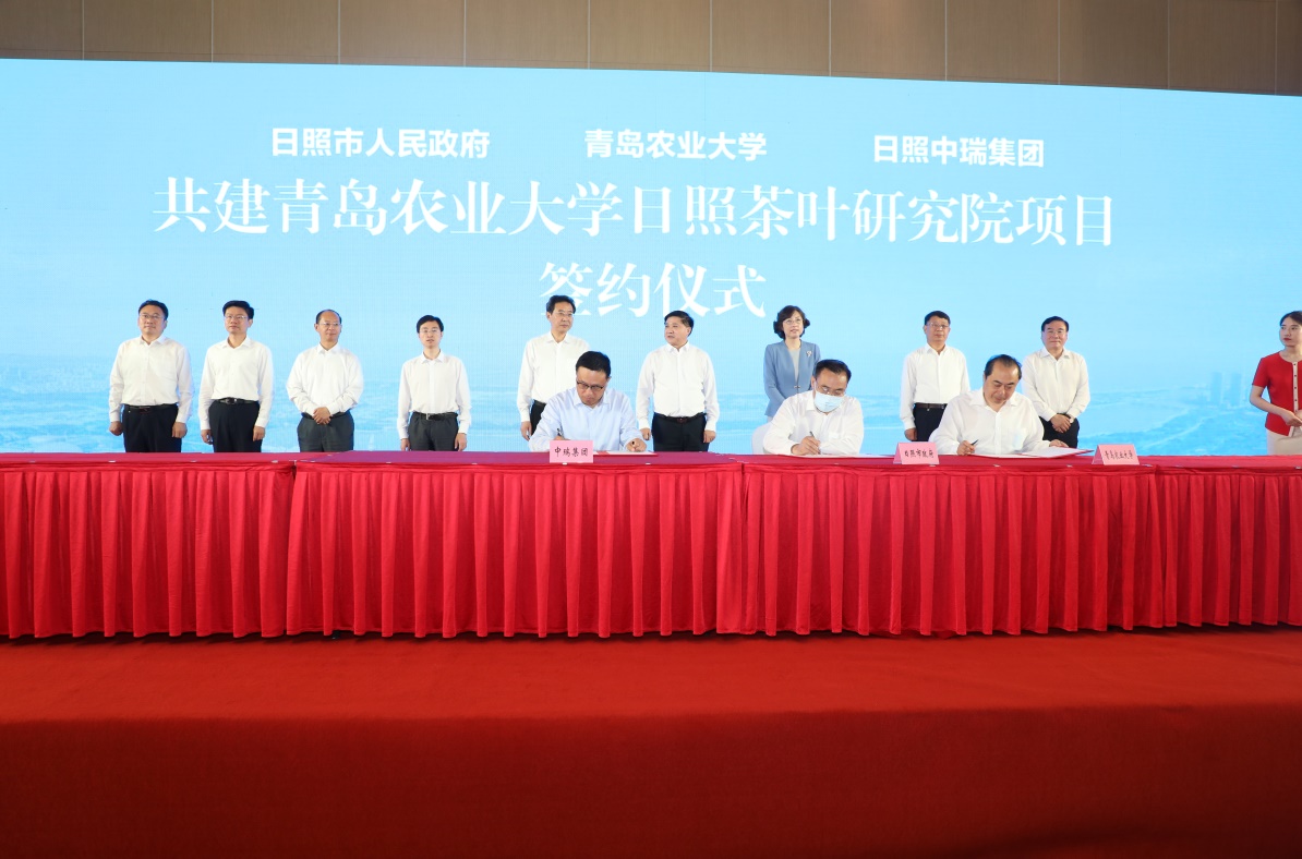 6月14日,由日照市人民政府、青岛农业大学和中瑞集团共建的青岛农业大学日照茶叶研究院合作签约暨揭牌仪式在日照市举行。山东省科技厅党组书记、厅长唐波,青岛农业大学党委书记李宝笃、副校长刘新民,日照市委书记张惠、市长李永红、副书记李在武,中瑞集团董事长王东升等出席研究院共建签约和成立揭牌仪式。