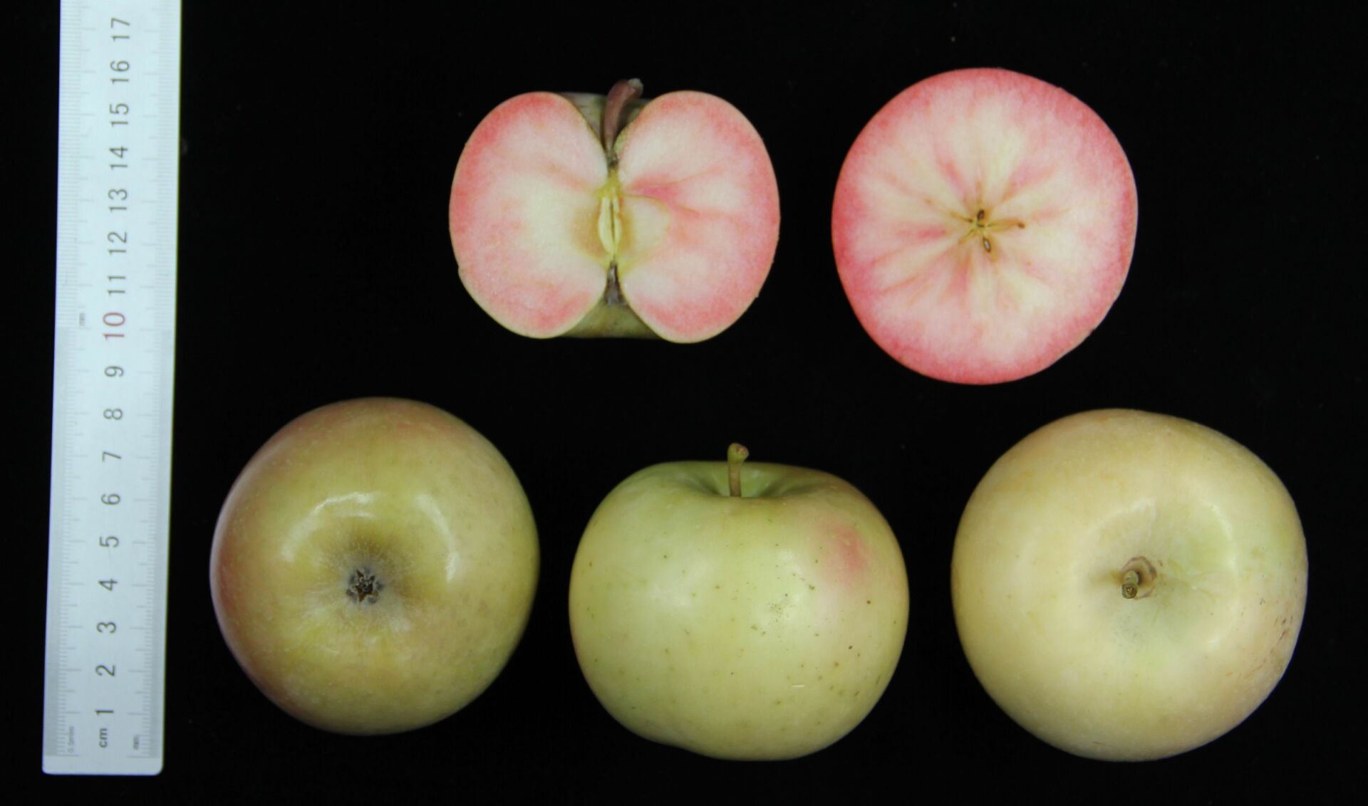 ‘黛红’是戴洪义教授、祝军教授和张玉刚教授等人以‘贵妃’ב王林’为亲本杂交育成的鲜食加工兼用型大果绿皮红肉苹果新品种。 2019年获得山东省林木良种审定(品种审定号:鲁S-SV-MD-012-2019);2019年获得国家植物新品种权证书(品种权号CNA20162427.9);2020年获得国家非主要农作物品种登记证书(证书编号GPD(2020)370017)。果实近圆形,果形指数0.75。果面成熟时绿色,阳面略带有红晕。单果重234g。果肉红色,果心处变白,汁液中多,风味甜酸,可溶性固形物15.40%,可滴定酸为0.56%,果实硬度7.8 kg/cm2 ,果实成熟期为9月下旬。